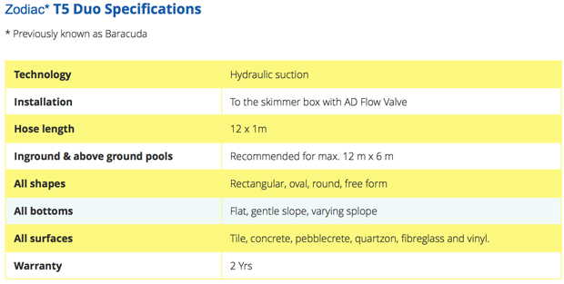 The Zodiac T5 DuoTM‘s ergonomic design and robust construction deliver maximum cleaning performance with minimum fuss, leaving you more time to enjoy your pool.