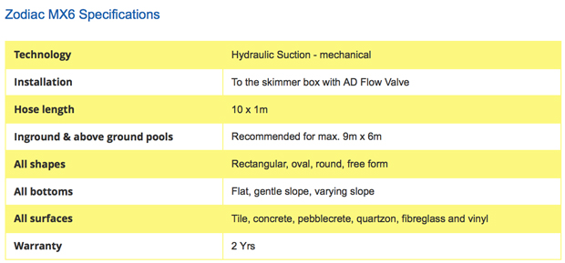 The Zodiac MX6 is compact in size, yet demonstrates a powerful and efficient clean. The MX6 has great manoeuvrability and provides total pool coverage through patented smart technology.